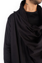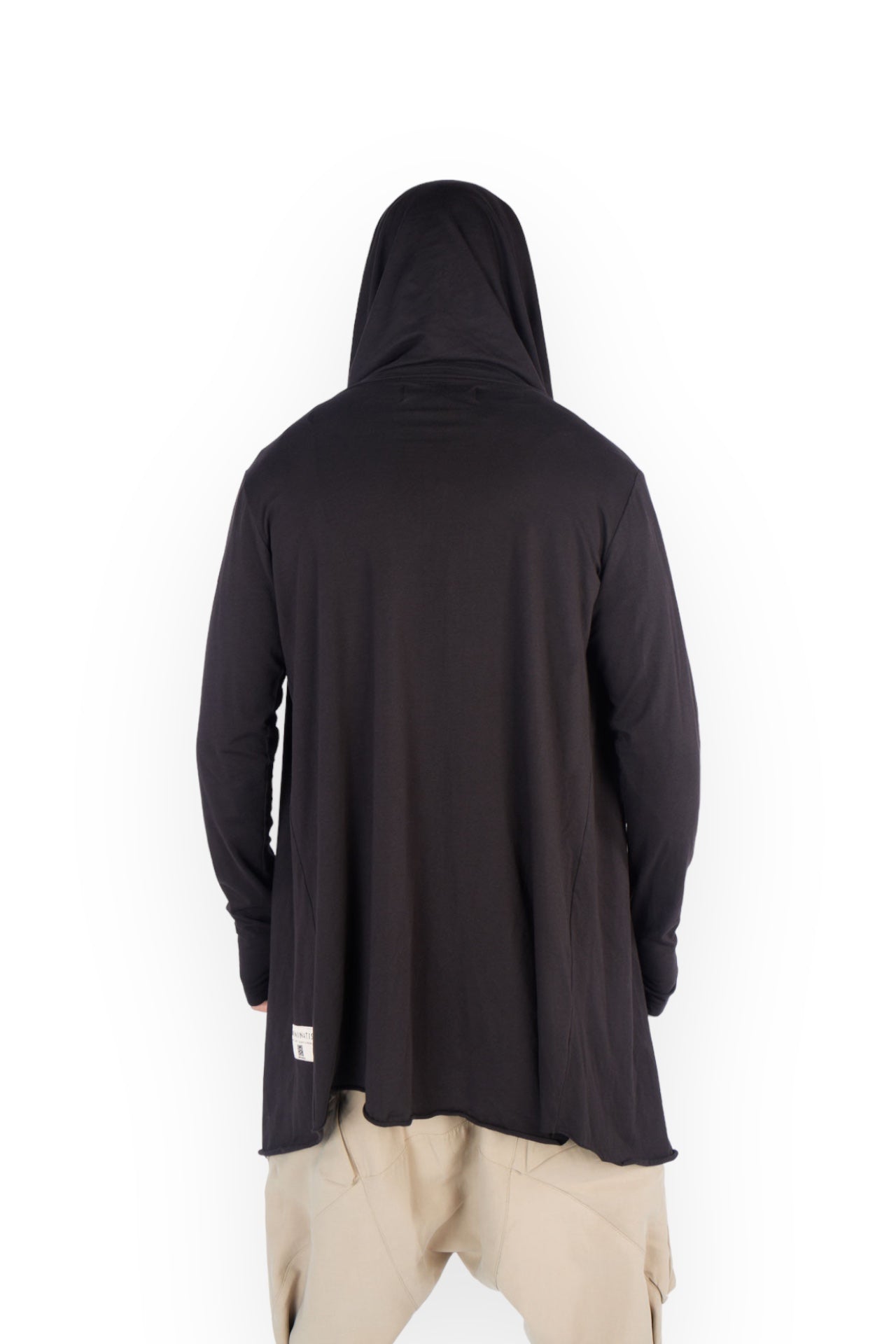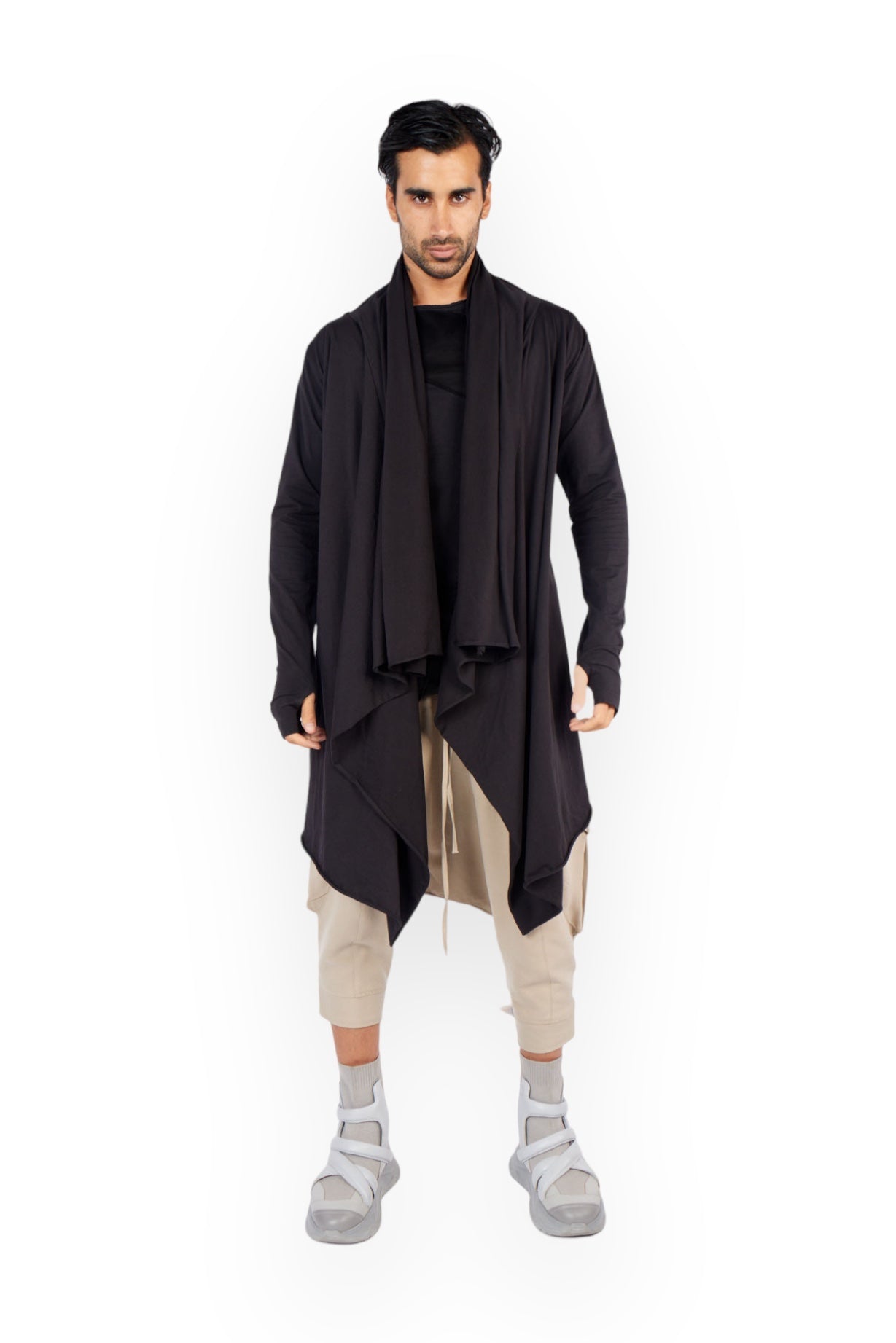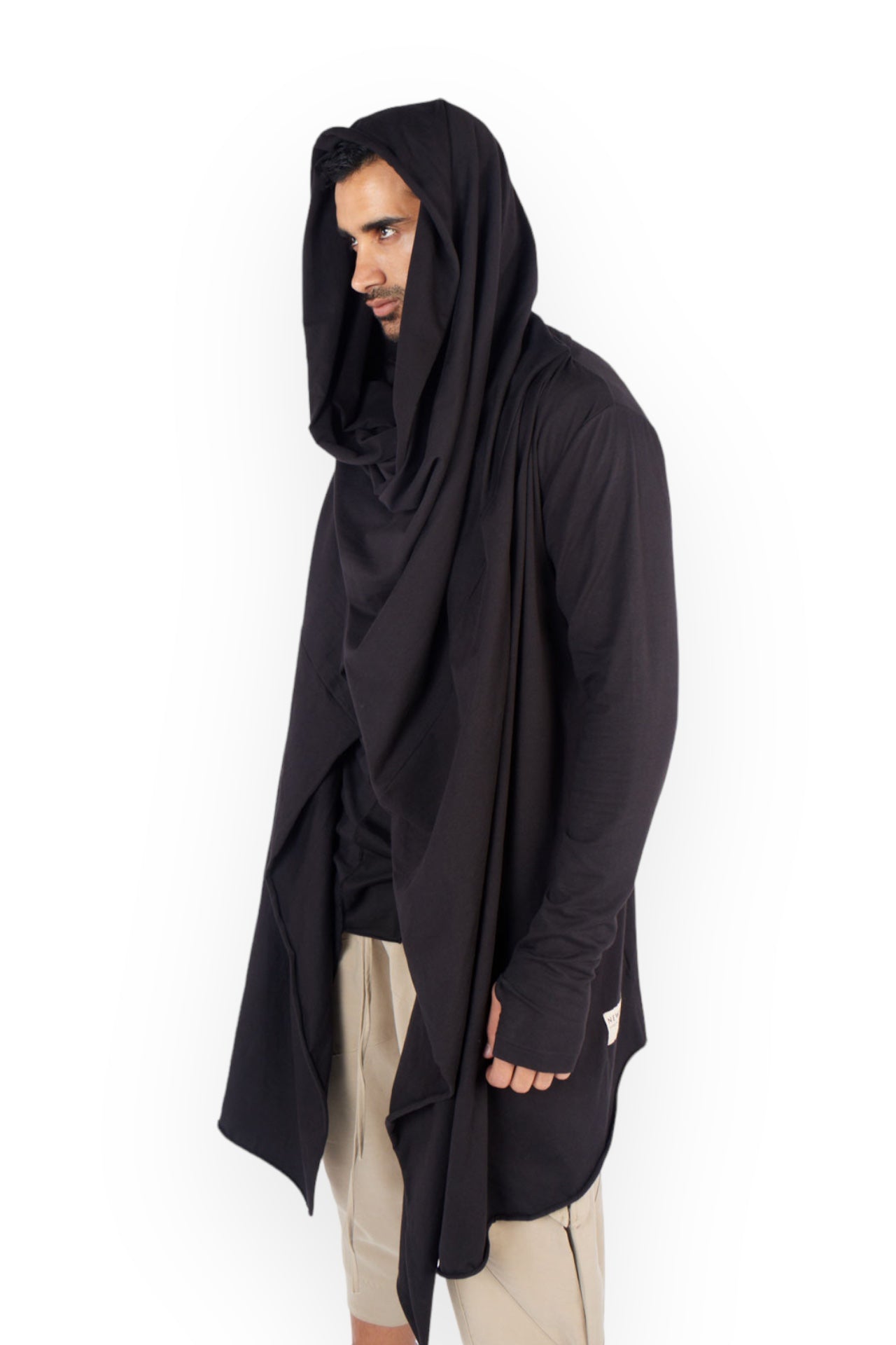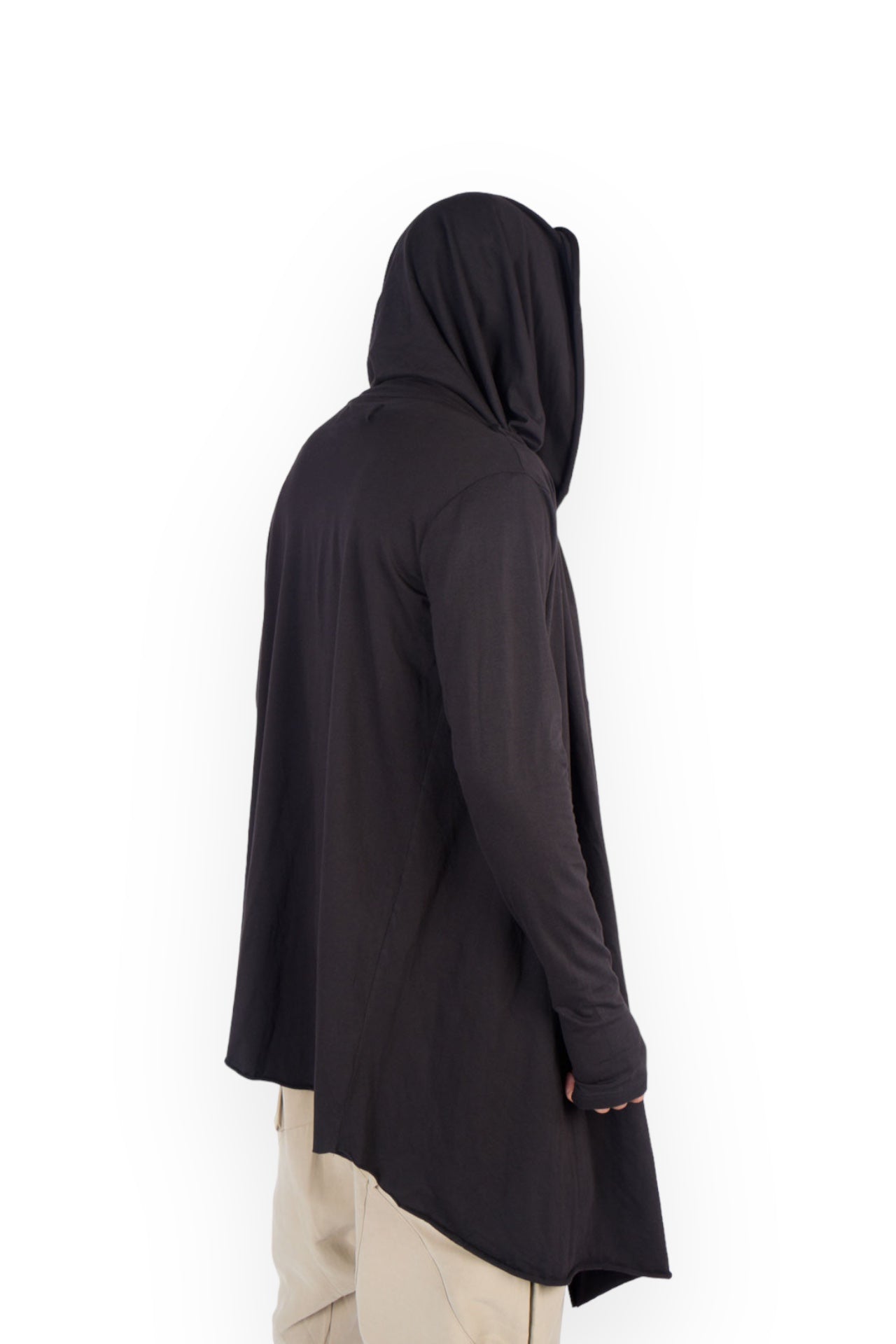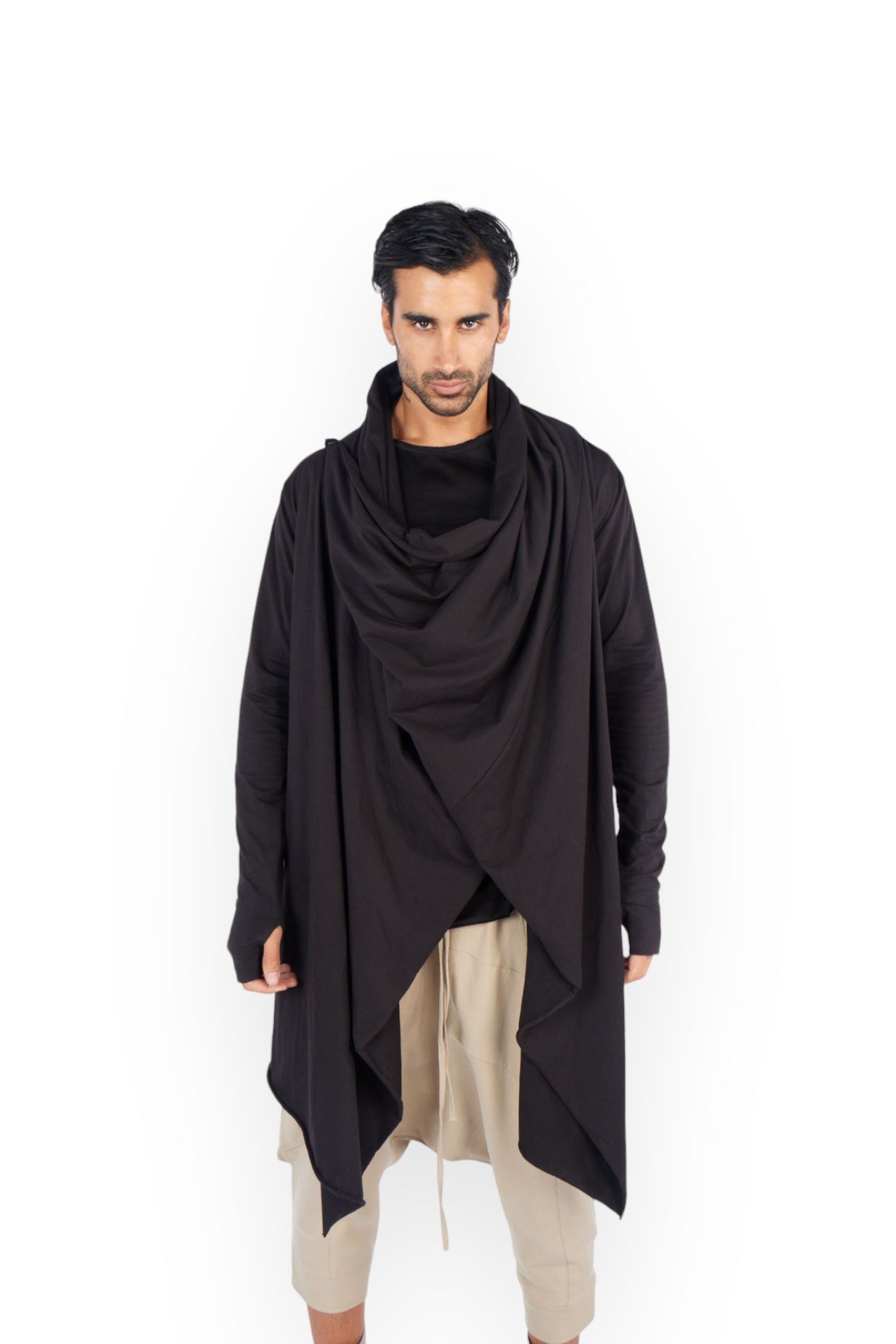 Introducing our cowl-neck long sleeve cardigan, designed to elevate your wardrobe with a futuristic touch: