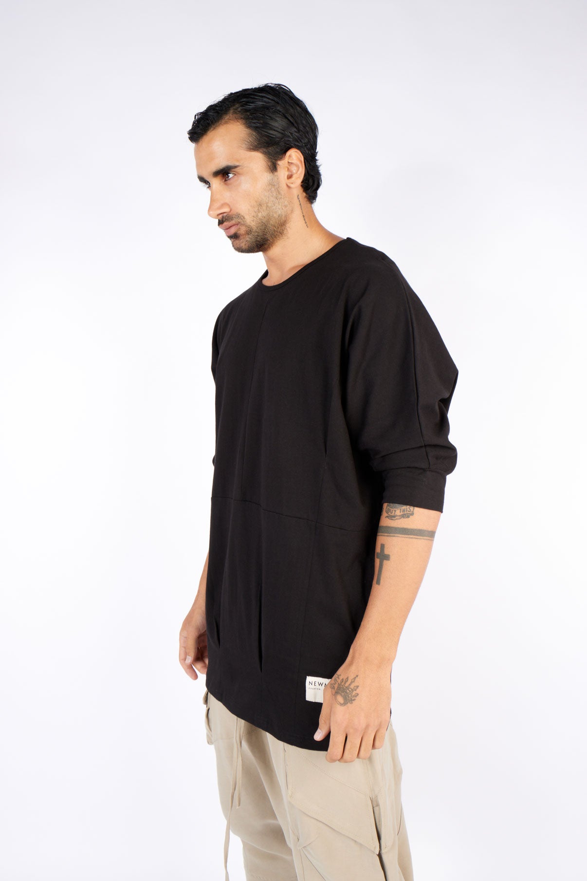 - Asymmetrical oversized fit cut;
